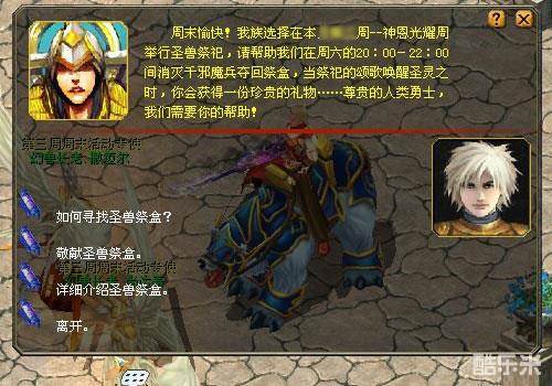 | 1.周六晚的活动共有4种类型,本次活动是随机出现的其中1个活动。 2.周六20:00-22:00之间,消灭各大主城外的千邪魔兵,可获得圣兽祭盒。 3.在周日24:00之前,前往各大主城的圣兽祭坛,将祭盒交给任意一位幻兽长老。20分钟后,在长老这里得领取圣灵的丰厚奖励。 | |