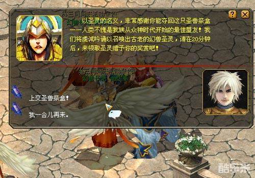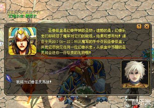 狂殴魔兵一顿后,你终于得到了一只神秘兮兮的圣兽祭盒,请速度把它交给最近祭坛上的幻兽长老。它们十分感谢你这位盟友的帮忙,并决定虔诚吟诵以唤出圣灵,让古老的圣灵赐你一份珍贵的礼物。