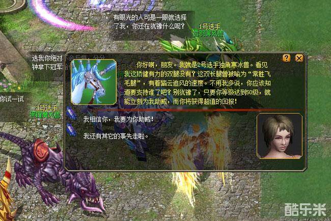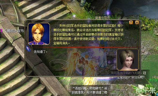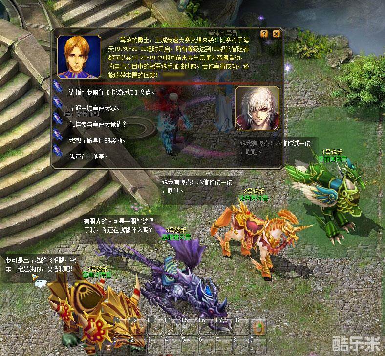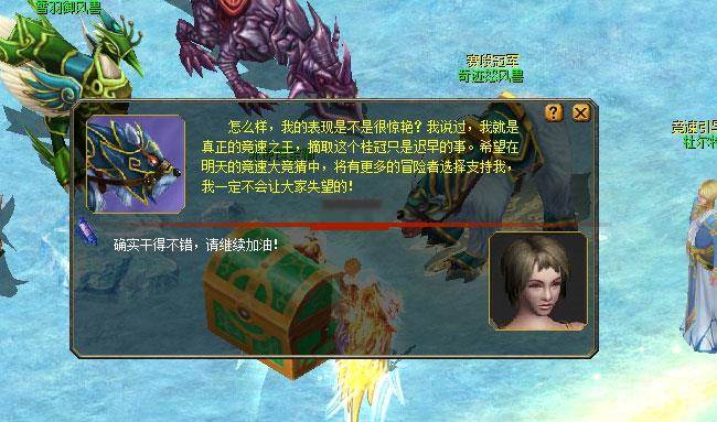 谁是真正的竞速之王? 即日起,每天19:30-20:00,卡诺萨城将举行紧张刺激、激动人心的王城竞速大赛!那么,身为观众的我们该怎么一起参与这场盛事呢? 每天19:20-19:29,等级达到50级的冒险者,都可以前往竞速引导员杜尔特处,参与竞速大竞猜活动。为自己心目中的冠军选手加油助威,还能收获丰厚豪礼! 这场赛事共有卡诺萨城、砺风戈壁、亚维特岛、雪狼冰原4个赛段,最先到达当前赛段终点的选手获得当前赛段的胜利。每个赛段比赛结束后,选手们会在新的赛点休息1分钟。 看到这些精神抖擞的选手们没?快上前与它们交谈一番吧。在它们出发前,你有10分钟的时间(19:20-19:29)可分别与它们聊一聊,然后再决定支持哪一位选手。只要你猜中每个赛段的冠军,就可以获得丰厚的奖励! 当时间走到19:30的时候,早已做好准备的选手们像离弦的箭一样冲出去,谁也不想落下一点。这是追风者的游戏,你可以选择跟随选手们的步伐,也可以去忙自己的事情。不过要记得随时留意赛况哦——这将关系到你能不能拿到奖励噢。 为了让赛事更加刺激和精彩,主办方在比赛沿途准备了一些“惊喜”:一些比赛选手可能会被幸运之神垂青、获得加速祝福;还有一些选手有可能遭遇主办方的恶作剧……看个人运气咯,听起来是不是很刺激啊? 时间一分一秒过去,卡诺萨城-砺风戈壁赛段的比赛即将结束,到底你的选择是不是对的呢? 你一路紧跟不舍,并随时留意赛况。正当你紧张不安的时候,赛事主办方发来通知——你支持的选手率先完成了这一赛段的比赛,获得了这个赛段的冠军! 你为自己犀利的眼光得意不已!简直就是再世伯乐嘛!现在,你可以去砺风戈壁的赛点休息处领取属于你的奖励啦! 温馨提示:每个赛段比赛结束后,选手们会在新的赛点休息1分钟。这时候你可以重新支持一位选手,但是不能重复支持同一选手噢。 很快,今天4个赛段的赛事都结束了。怎么样,你是不是还意犹未尽呀?没关系,明天同一时间,追风者的游戏等着你哟! | |