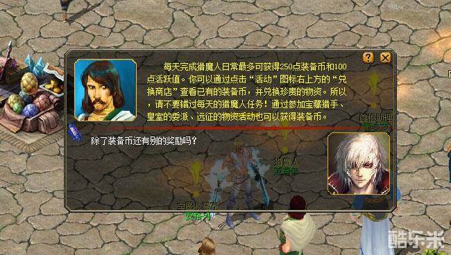 猎魔人是行走在大陆上的勇士,他们狩猎凶残邪恶的魔物,并凭此换取名誉和报酬。其中,范海辛是最著名的猎魔人之一,他号召所有勇士一起加入猎魔人的行列,完成伟大的猎魔人任务! 等级70级以上的勇士,每天都能从猎魔人范海辛那里接取2次猎魔人任务哦! 猎魔人任务分为两种,一种是普通猎魔人任务,一种是高阶猎魔人任务。范海辛将随机发放这两种任务。 普通猎魔人任务:击杀出没在七大片区的特定魔怪200只,清除魔怪之潮对该区域的影响。 高阶猎魔人任务:接受高阶猎魔人任务后,猎魔人范海辛会给予你一个猎魔人徽章。在猎魔人徽章的指引下,找到高阶魔物出没的地点。 好了,到达目的地后,再次使用猎魔人徽章,将高阶魔物召唤出来,并击杀! 然后你就可以回去找猎魔人范海辛交任务啦:40-50点装备币,以及活跃度奖励。 请注意,每天通过日常任务每人最多可以获得3个法宝[赠],日常任务包括猎魔人、宝藏猎手、皇室的委派、远征的物资,每天第一次完成以上日常时均有机会获得1个随机法宝[赠]。 | |