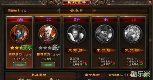 1.玩家在击败上一轮名将,和达到相应等级之后开启下一关的名将挑战