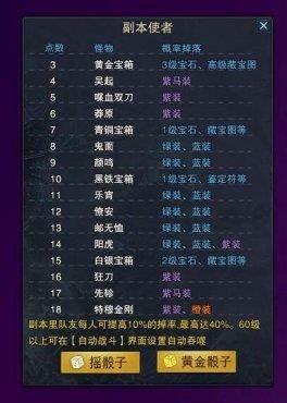 骰子分两种,一种紫色骰子可摇出1-18点随机点数召唤BOSS,头目,宝箱。黄金骰子只召唤BOSS和黄金宝箱。副本里队友每人可提高10%的掉率,最高达40%。BOSS之家副本掉落的装备如果骰子是绑定的,则掉落的装备为绑定装备。如果骰子是不绑定的,则掉落的装备为不绑定装备,可用于交易。