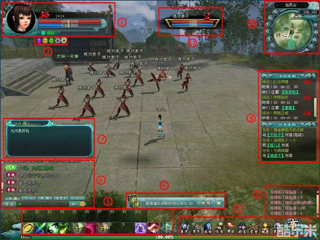 5.快捷技能道具栏:快捷技能道具栏可自由放入人物技能及部分道具,由F1~F10、1~+键控制。