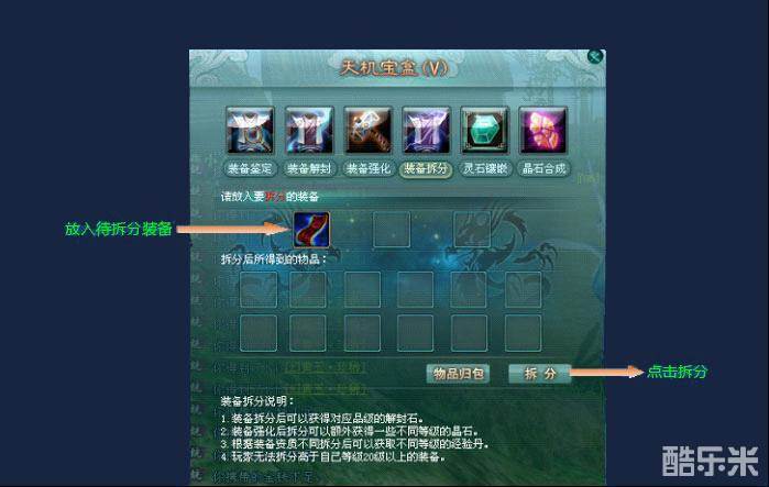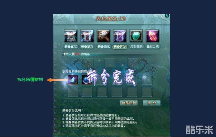 拆分成功后将获得解封石和经验丹药。拆分所得解封石和丹药与装备的颜色、星级相同。