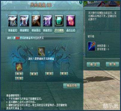 3、将灵石放入材料框,将装备放入装备框,点击镶嵌即可。