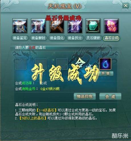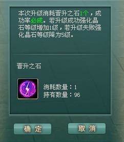 1、升级成功后,低级强化晶石消失,生成高一级强化晶石。