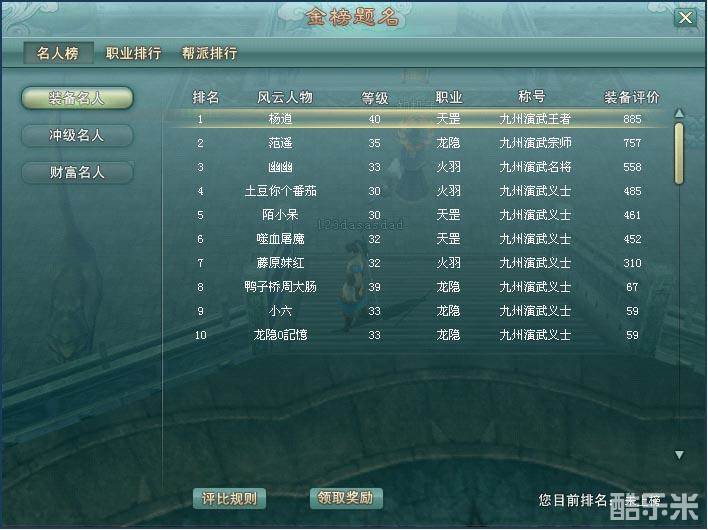 职业排行中的装备、财富、冲级榜规则与名人榜相同,只是评比对象是职业之间。
