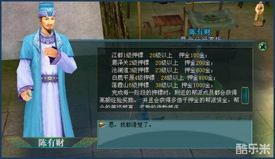 活动形式:活动共分为5个阶段的押镖任务,玩家每日每级任务押镖只能完成一次,且接受高一级的任务,必先完成低一级的任务,领取每阶段的押镖任务,需要支付相应的帮派资金作为押金。完成每阶段的任务时,附近的帮派成员都会获得高额的经验奖励,并且会获得多倍于押金的帮派资金,帮派等级越高,资金倍数越高。