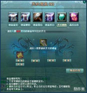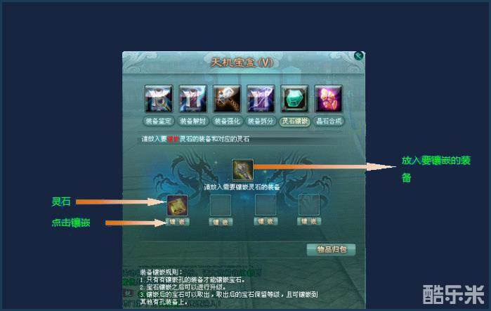3、将灵石放入材料框,将装备放入装备框,点击镶嵌即可。