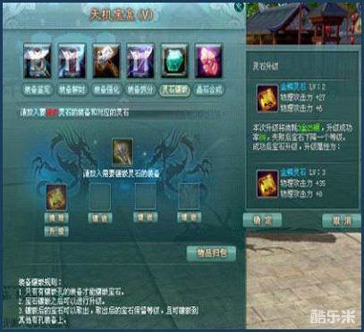 2、玩家在镶嵌灵石后,可在“灵石镶嵌”的界面中对已镶嵌的灵石进行升级的操作。
