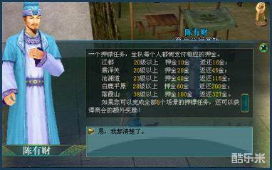 活动简介:玩家在活动时间段内,可以以组队的形式在江都【陈有财】处协助陈氏商会押送镖车,押送共分为5个阶段任务,每个阶段任务都困难重重,但酬劳也相当丰厚,每一阶段任务护送前,参与的每个玩家需要先支付押金,待到玩家成功护送到达目的地,玩家可获得高额的回报;如果玩家能完成全部5个任务,还可以获得额外的奖励。