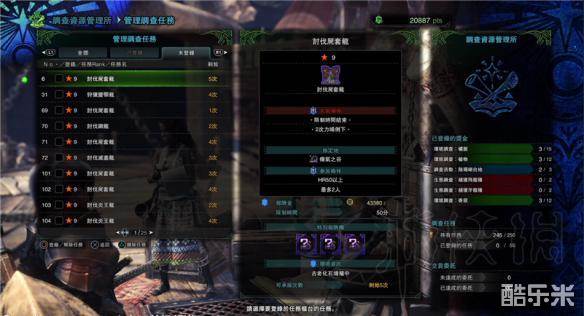 随着怪物猎人世界游戏的进程,相信各位的调查任务中都塞满了各式各样怪物的调查任务。在如此多的任务下,要找到自己想要的可不容易——毕竟游戏里并没有给任务排序的功能。但通过巧妙运用调查资源管理所的调查任务接受功能,即可很快地找到自己想要的任务。
