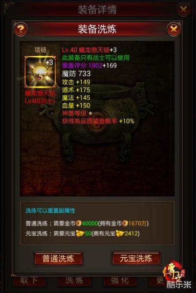 装备洗炼可给勇士带来想要的属性。橙色装备有四条洗炼属性,分别为攻击、道术、魔法、血量。不同职业所为了提升攻击所需要洗练的属性也不一样,生猛战士需要攻击,法师需要加魔法,道士则需要加道术。当然,无论哪个职业,血量都是必须的。