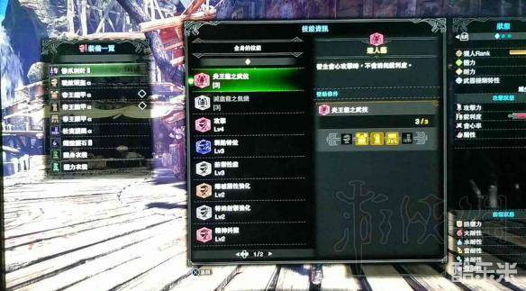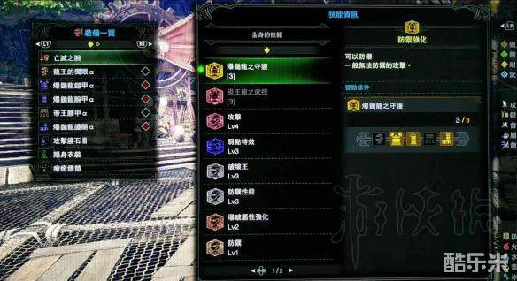 第二套适合需要防强的怪,或者觉得跑不开防强才能防的技能时用的。配装时考虑的技能优先级是防强、防3、弱点特效、攻击4,最后配出来搭一颗破坏王有破坏王3,还是需要一颗送的攻击珠。