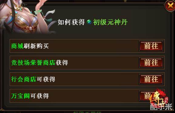 默认初始元神的星级为0,每个星级所需要的道具都不同。元神从0星升到2星需要的是初级元神丹,2星到3星需要中级元神丹,3星到4星需要高级元神丹,4星到5星需要仙级元神丹。我们要怎么获得这个道具呢?除了要在商城、竞技场荣誉商店、行会商城、万宝阁获得,还可以在获得副本中获得。