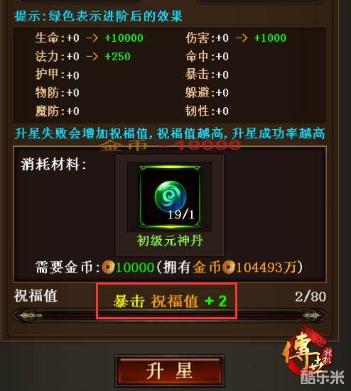 我们点击升星时不是马上进入下一星元神,点击升星后成功则升级到下一星级,失败则增加祝福值,点击升星如果有暴击会更高的祝福值哦。祝福值越高,我们升星的成功率也就越高。升星的同时也会消耗金币,我们可以在25级至29级的时候是多打些元神丹的活动副本,然后30级的时候打几个金币的活动副本,这样对于我们升阶元神就方便多啦!