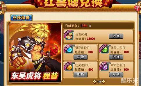 神将世界程普需要使用16000个红喜糖兑换获得,红喜糖需要在城池“净化祭坛”先把黑喜糖净化才能获得。
