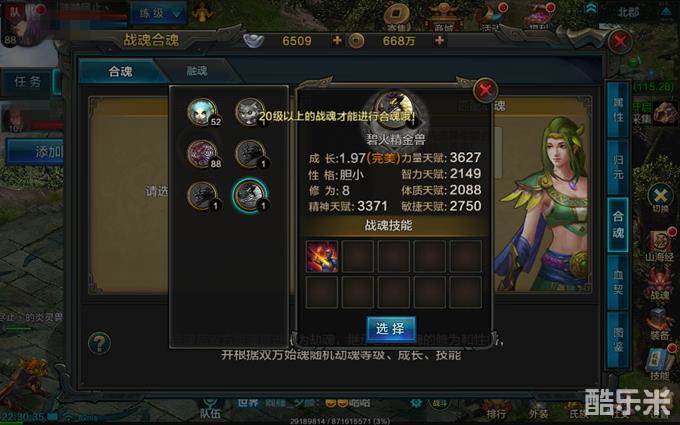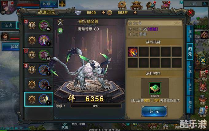 在选择好并获得适合的战魂后,可点击右下角的战魂图标,打开界面开始归元。归元丹可在商城直接购买,也可以用氏族贡献、银两兑换,系统也会赠送一部分,校场训练亦可获取。通过归元,可使战魂的修为和成长改变,洗出来的始魂资质直接影响合魂出来的劫魂质量,因此这一步绝对不能马虎。归元出始魂后,我们要着重观察它的“三围”,即修为、成长、性格。