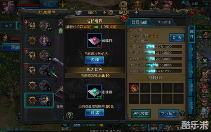 其中最重要,也就是最先注意的是成长值。因为归元后成长值只能通过炼魂丹(商城购买)提升,而炼魂丹只有五次的使用上限。也就是说,成长值的提升空间十分有限,成长值越接近战魂图鉴所示的上限越好。前期大家手上战魂资质都比较低,只是过渡时期用的,所以刷到卓越就差不多了,而到后期,最少也要到完美,最好刷到史诗。
