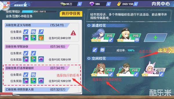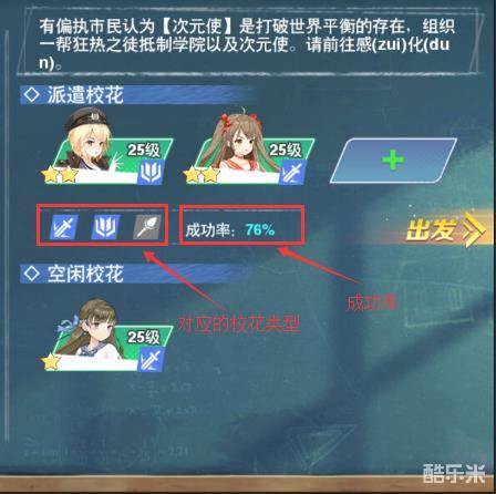 3、每个任务都有成功率,越高级的任务对校花的要求越高。影响成功率的因素有:校花等级、星级、战斗力以及任务所需的校花类型搭配。