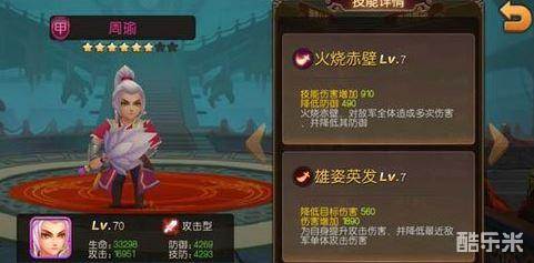 和岳飞差不多的样子。生命特别贫弱。其他属性也不同程度上弱一些。技能雄姿英发。降低目标80伤害且提高己方270攻击。这个技能会对最近的单位使用。所以一般是对T用。加攻效果大概会持续1到2次平砍。由于加攻效果会被晕眩限制且只能攻击防御最高的T。因此效果可以说及其一般。