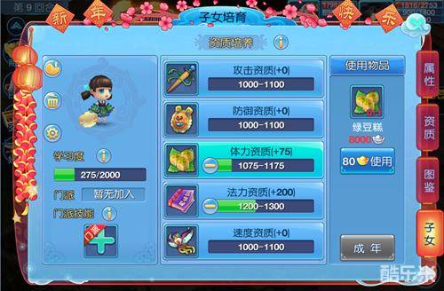 小编强烈建议将子女的四项资质喂完再成年。注意看清楚子女是拜入什么门派,物理攻击门派就不要加法力,法术攻击门派就不要加攻击。说是这么说,填资质这里也是一笔巨款,培养满资质一共要64万银币。