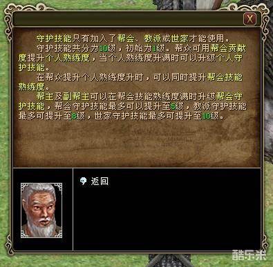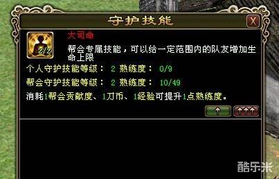 (注:右侧红按钮为提升帮派守护技能(仅帮主、副帮主可见);左侧为按钮为提升熟练度)
