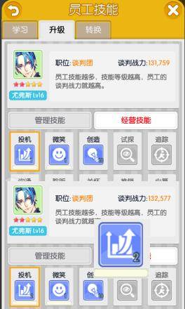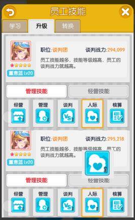 商会技能也是增加5%,和人资部一样,前面10级-20级是无压力升级的,白给战力不要白不要,无压力升级全体员工加2000-3000,20级外加的越多当然越贵