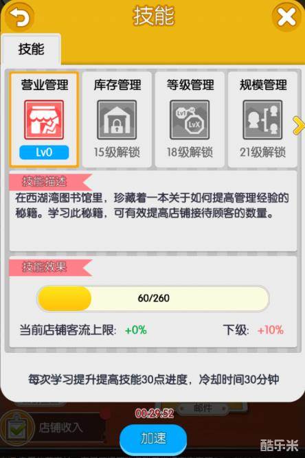 这点小技巧能让你领先别人快一步升级技能。而且,前期的话, 营业管理相对来说对游戏的帮助比较大一点,20级之前可以先升级营业管理,而且营业管理升到LV2较其它所需经验少很多。接下来继续跟着任务引导,如果想要快人一步,点的时候那就要快一点了。