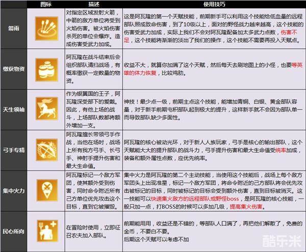 兵种、英雄搭配:从技能上来看,阿瓦隆拥有的弓手专精让他在兵种搭配上显得明确。配上弓箭手等远程兵种能最大限度加强该英雄的作战能力,在这我列出几种情况对应搭配。