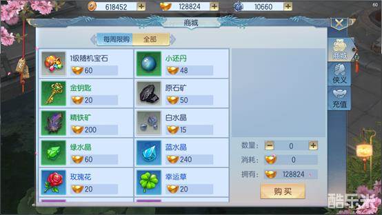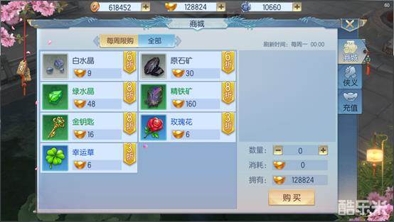 在《那一剑江湖》的世界里,商城是购买强化水晶,突破矿石及宝石宝箱的地方。在商城购买物品需要消耗元宝。目前商城主要由每周限购和全部两部分组成。
