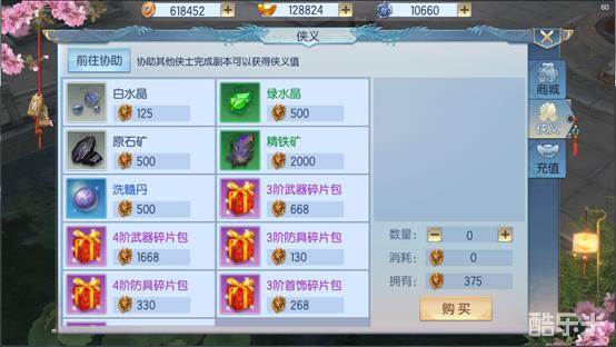 协助其他侠士完成副本可以获得侠义值,侠义值可以用来购买升级装备材料:水晶与矿石,神兽洗髓丹,与装备碎片礼包。