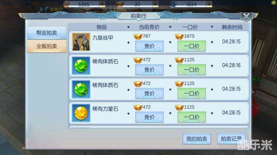 各位少侠可通过不断竞拍的形式来获取自己想要的物品,若出现了稀有的神兽宝石等道具,可选择一口价购买,防止在拍卖结束前被不小心顶掉,错失了购买的最佳机会。帮会拍卖的元宝将由帮会内成员分红获得,如果流拍将损失一定的价值,但依旧可获得剩余价值的分红。