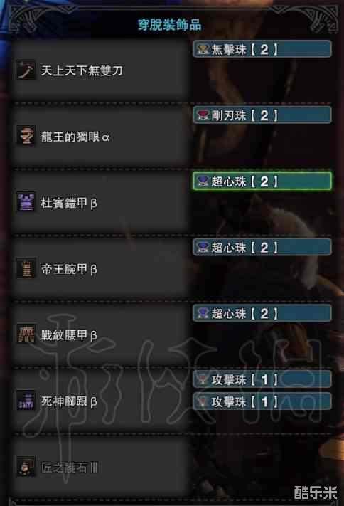 其中杜宾胸是我比较喜欢的一个配件(主要是好看),也可以替换为钢龙或者旅团(丑了点)然后加上浑身珠出混1攻4或者浑2攻2,输出期望略高一些,但lz没错过了浑身珠,就没那么配。这个面板是终极面板,双天刀客制强化会心,全装备强化到顶,共计264的倍率,483的防御。