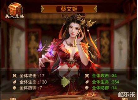 1.美人可为全体将领提供大量攻击、生命、防御。