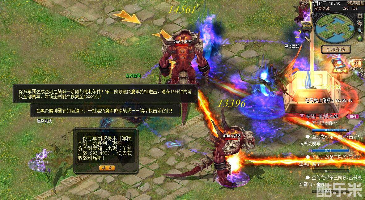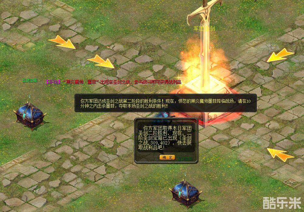 军团远征魔界疆土之时,魔族对人类的仇恨也达到了顶峰。作为人类帝国中声誉卓著的军团之一,魔族黑炎魔帅将会对你方军团开展残酷的报复和逆袭! 每天19:00-20:00,黑炎魔帅都将率领黑炎魔军进袭各大军团驻地,意图摧毁军团圣剑!届时,各大军团领袖必须率领军团成员抵御黑炎魔军。作战时间,找到军团领地军需官·嘉斯即可进入军团领地。 一旦军团长做好准备,即可点击军团圣剑,开启圣剑之战! 圣剑之战共分为三个阶段,请军团勇士们协力取得每个阶段的胜利——每个阶段取胜后,都能获得一份丰厚的回馈哦! 第一个阶段:15分钟内,会有5波黑炎魔族进袭圣剑,同时黑炎魔火会不断灼烧军团圣剑。你们必须在15分内击杀全部黑炎魔族,并且将圣剑耐久修复到7000点,才能进入第二阶段。 那么要如何修复圣剑呢?在军团领地分布着圣剑水晶,采集圣剑水晶后对军团圣剑使用,即可恢复一定的圣剑耐久。 如果在时限内,没有击杀全部魔族,或者未将军团耐久修复到7000点,那么你们就输掉了今天的战斗。 而一旦战斗胜利,那么就会天降圣剑宝箱——只要今天场内击杀黑炎魔怪数量达到5只或者为圣剑恢复5次耐久,便可以去开启宝箱,收获巨额惊喜了! 第二阶段:15分钟内,会有5波黑炎魔族进袭,这个阶段的胜利条件是在15分内击杀全部黑炎魔族,并将圣剑耐久修复到10000点。 第二阶段胜利后,符合条件的军团成员可以去开启二阶圣剑宝箱获取奖励哦。 战争的最终阶段,恐怖的大魔王黑炎魔帅墨菲会出现在战场上,所有小伙伴必须齐心合力,将墨菲击倒,即可取得整场比赛的胜利。 而黑炎魔帅墨菲倒下后,对其造成一定量伤害的军团勇士都可以开启三阶圣剑宝箱获得奖励。特别提醒,最终击杀墨菲的勇士还能额外获得1份奖励哦! 军团圣剑保卫战,战魔族、赢豪礼——请绝对不要错过! | |