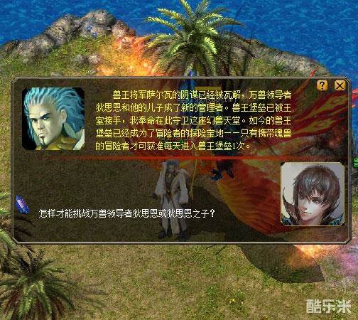 暗影骑士阿加西负责在兽王堡垒门口接引冒险者。他告诉你如今万兽领导者狄思恩和他的儿子成了新的管理者。如今的兽王堡垒已经成为了冒险者的探险宝地——只有携带魂契幻兽(本体宠天生即魂兽)的冒险者才可获准每天进入兽王堡垒1次。