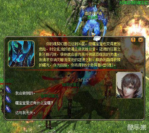 | 任务奖励 | 【魂契幻兽低于30星】 可在战神藏宝室中获得2星兽魂精魄。 【魂契幻兽达到30-星】 可在战神藏宝室中获得4星兽魂精魄; 打败寇德的狂暴之影后可开启战神的宝箱,有几率获得充沛精力礼包、幻化幸运草或大量经验; 最多可获15枚超值转世水晶; 完成遗迹守护者奥法恩的任务,可获得5个奇异兽O型魂兽包,打开可获得1只赠品属性的奇异兽O型[魂]。(每个角色仅限一次) |