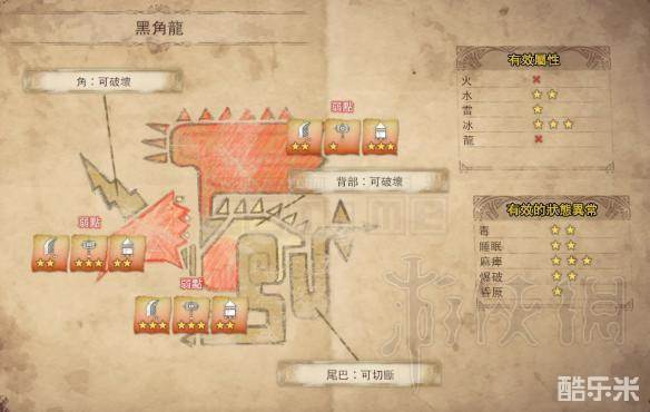 黑角龙和角龙一样,属性弱点是冰,状态异常弱麻痹。