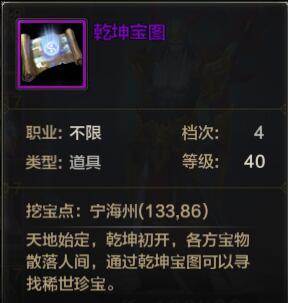 在背包中查看乾坤宝图选择使用,角色会自动寻路到指定的坐标上,使用后会弹出一个八卦盘,八卦盘上有乾、坤、艮、兑、坎、离、巽、震,指针会转两次得出卦象,根据不同的卦象获得不同的奖励。乾坤宝图的奖励都是随机的,奖品包括青玉鸟坐骑、8级宝石、强效战魂技能书、九锡晶元、五色石、山海经材料和1000万铜钱等奖励。