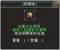 帮会小贩那里还卖回帮珠,在野外使用回帮珠,可以瞬间回到帮会,再从帮会传送出去,我们又会回到原地。这对于野外练级来说,好处不言而喻。但要注意,在副本场景(比如刺杀狼王的场景)中不能使用回帮珠。
