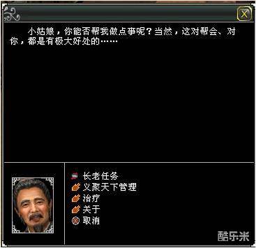 在帮会长老这里可以领到帮会任务并向其交任务。还可以通过他设置帮会小贩和帮会护法。强烈建议先设置小贩,这是帮会获得实际利益的重要途径!
