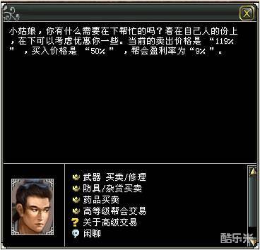 向他卖东西价格会比外部游戏世界高,高出部分成为帮会盈利,自己只获得部分帮会贡献度。当帮会发展度高于60%时,向他买东西,价格会比外部世界低。本帮发展的越繁荣强盛,降价幅度越大。买东西时会消耗一定帮会贡献度。而帮会贡献度会按一定比率换算成帮会声望。大家在小贩这里消耗的贡献度越多,帮会所得的声望也越多。