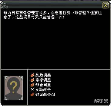 通过他可以获得帮会分红(领薪水),并且进行帮会常务管理: