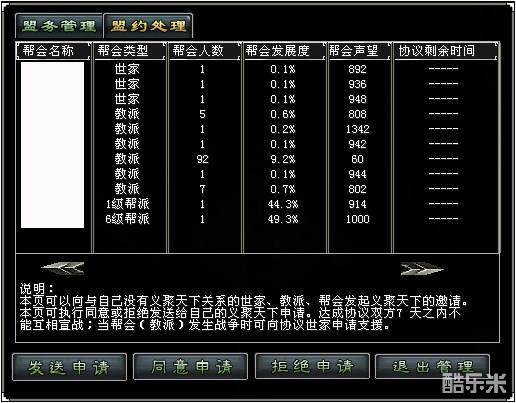 世家与教派达成义聚天下关系,世家将会获得50万的奖励,协议有效期为7天,协议期间:达成协议的双方不能相互宣战征讨;当教派发生战争时,可以100万帮会资产为代价向有义聚天下关系的世家申请同盟军支援,若世家同意对方的同盟军申请,将获得50万帮会资金的奖励,并可以向同盟教派派遣16名本世家成员参与对方战争。