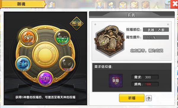 在御魂系统中,你可以向五位上古神兽祈福,从而获得他们的祝福。五位天神各自执掌着不同的领域,可以强化你各部位的装备,你可以选择优先祈福的对象,获得对应装备属性的提升。