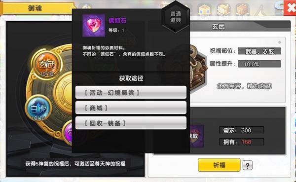 御魂祈福的必要材料信仰石,可以通过“活动—幻境悬赏”、“商城”、“回收装备”方式获得。