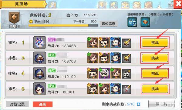 选择自己想挑战的对手进行挑战,挑战的对手不同获得的积分会有所不同的哦,阵容的选择对战局也是会有影响的。