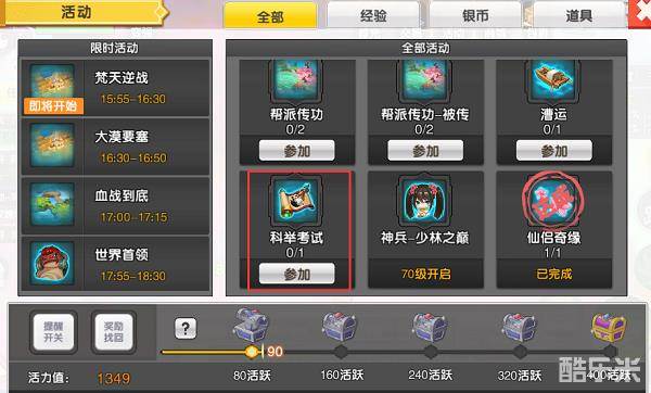 点击活动列表,找到科举考试活动参加活动