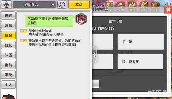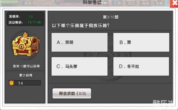 每人每天可以回答10题,答对答错都可以获得经验和金币奖励,答对奖励翻倍。完成全部10题之后,可以获得科举宝箱,内含大量银币